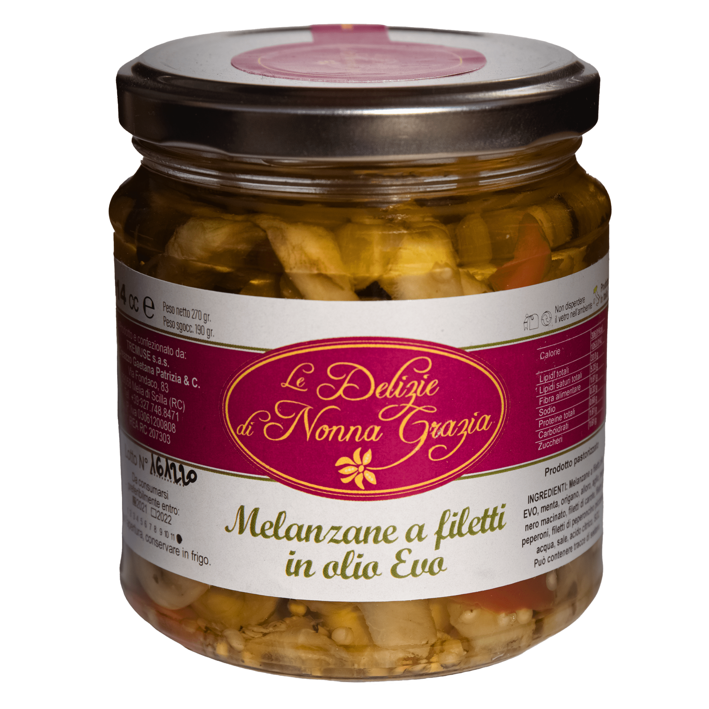Fillet aubergines, EVO oil, mint, oregano, bay leaf, garlic, ground black pepper, carrot fillets, pepper fillets, hot pepper fillets, water, salt, citric acid, SO2.